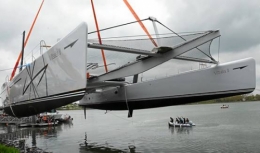 Posé une fleur sur l'eau Peu après 16 h 30, la manœuvre a commencé. La grue d'une capacité de levage de 400 tonnes a doucement soulevé « Vitalia 2 » pour aller le poser quelques minutes plus tard, comme une fleur, sur l'eau. Une opération toujours délicate dont le succès a été salué par les applaudissements du public. Ensuite, il a fallu répéter la manœuvre pour déposer la bôme et le mât de 45 m de long sur le bateau.